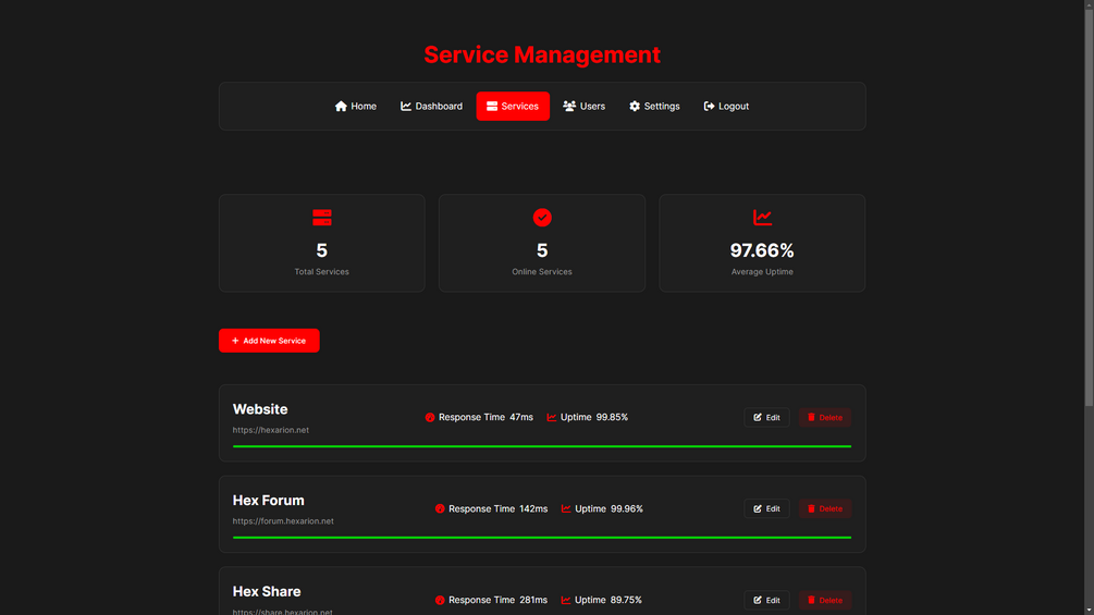 A powerful, modern service monitoring solution designed to provide real-time insights into the health and performance of your online services. With cutting-edge features and an intuitive interface, Hex Status ensures you remain in control at all times.